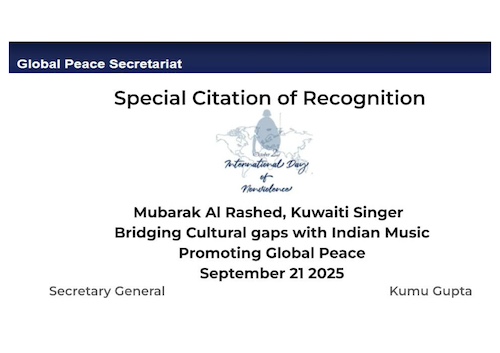 Press Release 09/21/2025 Global Peace Secretariat to present Special Citation to Kuwaiti Singer Mubarak Al Rashed for U.N. International Day of Peace Global Peace Secretariat to present Special Citation to Kuwaiti Singer Mubarak Al Rashed for U.N. International Day of Peace celebrated on September 21st, for promoting global peace through his singing of Indian songs in Hindi, Kannada, Konkani and Tulu performing in Kuwait, India and Sri Lanka. “Mr. Mubarak Al Rashed fondly called the “Kishore Kumar of Kuwait” and a Cultural Ambassador bridges cultural gaps bringing together people of Kuwait and India with other countries by singing Indian bollywood, devotional and patriotic songs promoting global peace”....Secretary General Kumu Gupta. Mr. Mubarak Al Rashed has had the honor of singing in front of and mesmerizing P.M. Modi and former Minister of External Affairs Mrs. Sushma Swaraj on their visit to Kuwait. See https://www.tiktok.com/@abhi_coolll/video/7450501564923432200 for rendition of “Vaishnave Jan to” during P.M. Modi’s visit to Kuwait, a first in 43 years by an Indian Prime Minister, the last time being by Mrs. Indira Gandhi. The International Day of Peace was established in 1981 by the United Nations General Assembly. To inaugurate the day, the United Nations Peace Bell is rung at U.N. Headquarters (in New York City). The bell is cast from coins donated by people from all continents except Africa, and was a gift from the United Nations Association of Japan, as "a reminder of the human cost of war". The inscription on its side reads, "Long live absolute world peace". The United Nations marks its 80th Anniversary on October 24 2025. U.N. Photo Credit : Mark Garten ![]() You may also access this article through our web-site http://www.lokvani.com/ |
