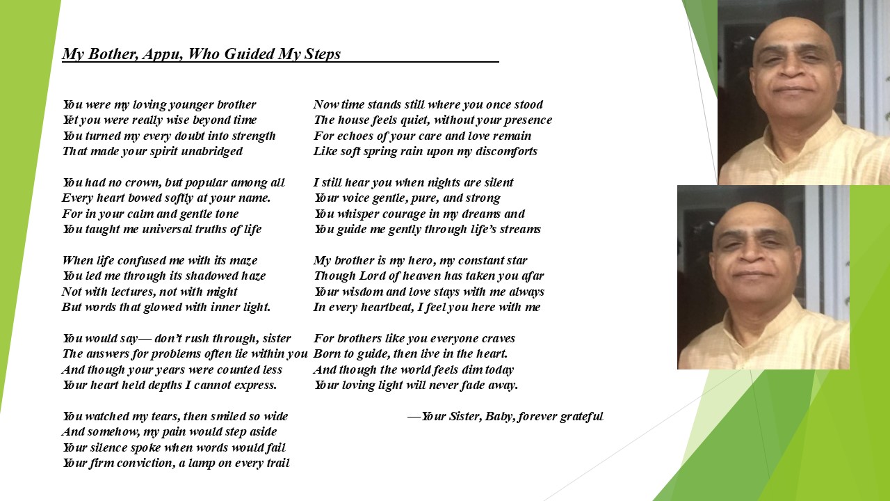 Dr. Patil is survived by his beloved wife, Anju Patil, his son, Manu Patil, and his daughter, Medha Patil. He will be deeply missed by his family, friends, and the countless colleagues whose lives he enriched with his wisdom and warmth.