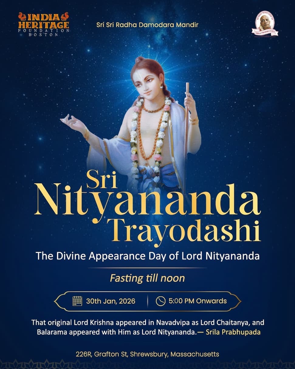 You are invited to celebrate Sri Nityananda Trayodashi, the divine appearance day of Lord Nityananda, at Sri Sri Radha Damodara Mandir.