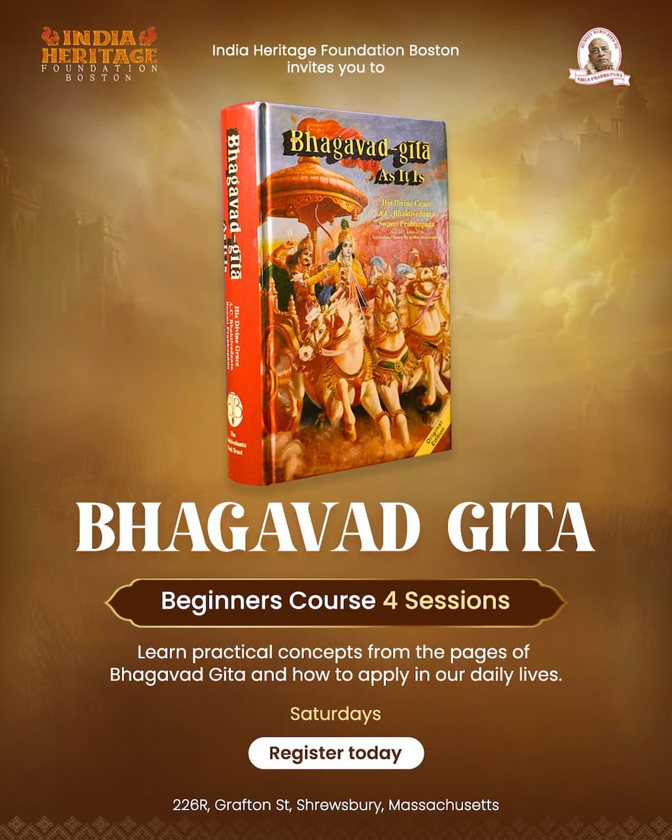 We're introducing Bhagavad Gita courses designed to support both new and continuing students of Vedic wisdom. The Beginner Course offers a practical introduction to the Bhagavad Gita, focusing on core concepts and how to apply them in daily life. We will host 4 of these courses on each Saturday. The Intermediate Course explores four thematic topics from the Bhagavad Gita, including world religions, why Krishna, the art of mind control, and perfect knowledge. Sessions are interactive and followed by Q&A. The Intermediate Course begins Sunday, January 18, 2026, at 4:00–5:00 PM. Join us to deepen your understanding and engage with timeless wisdom in a thoughtful, guided setting.