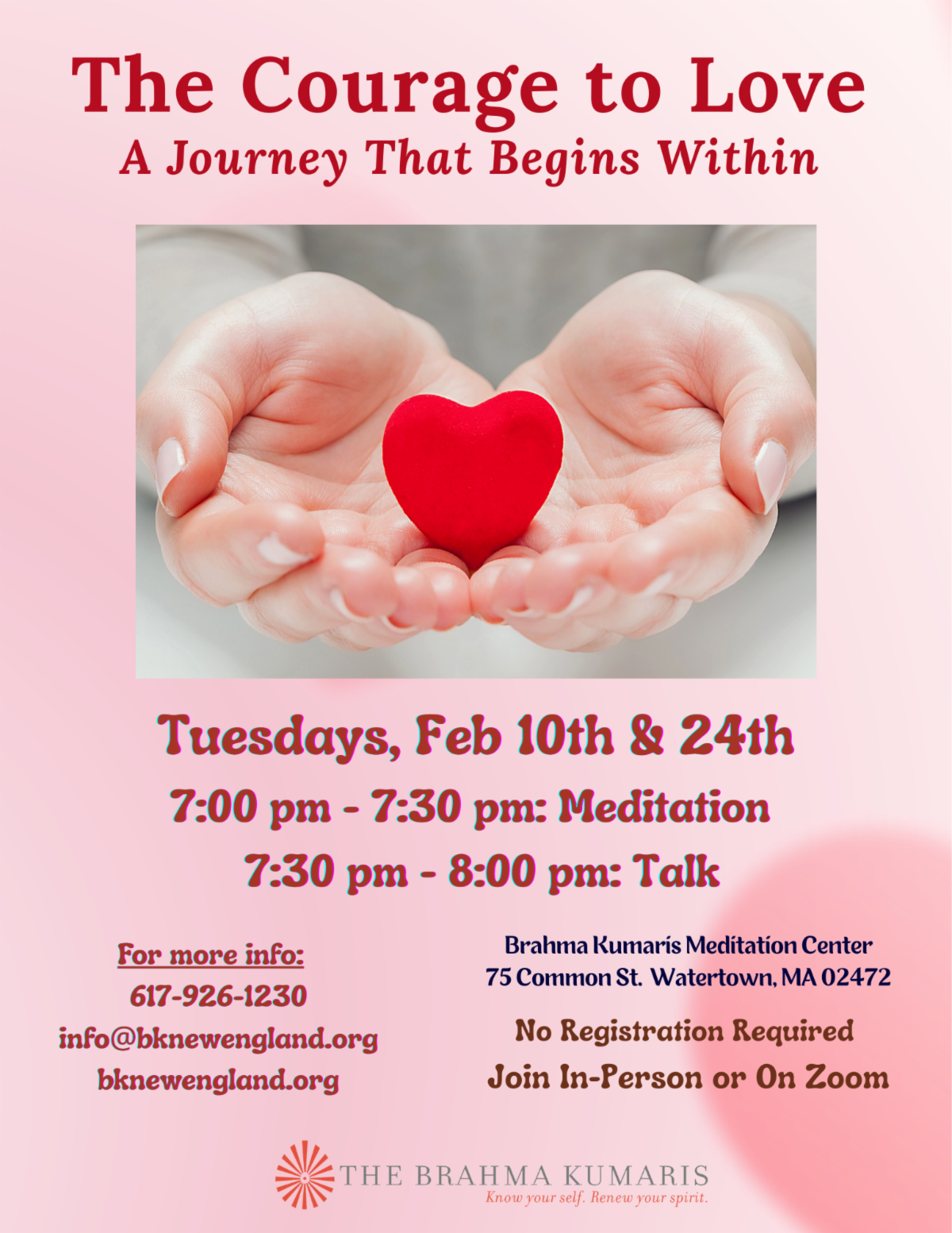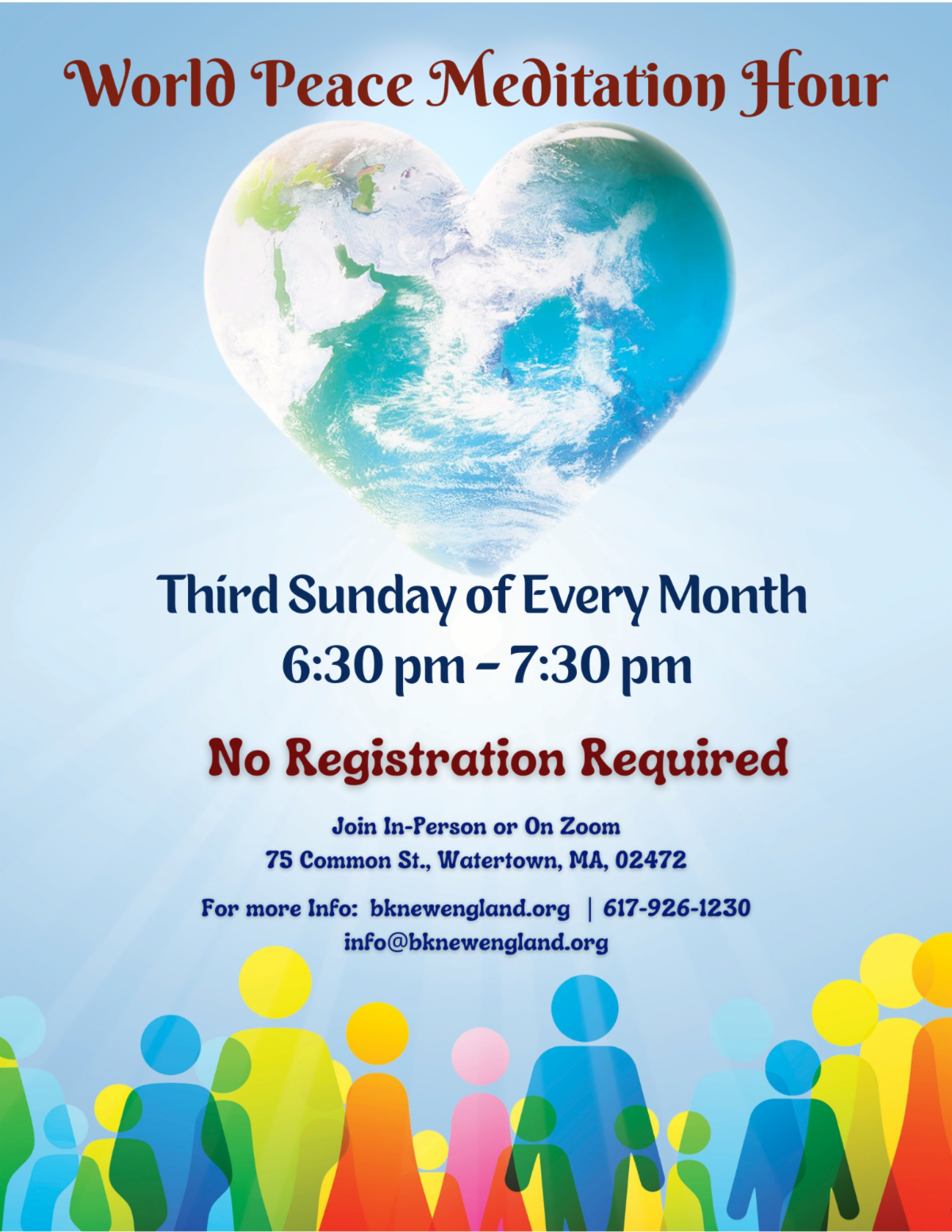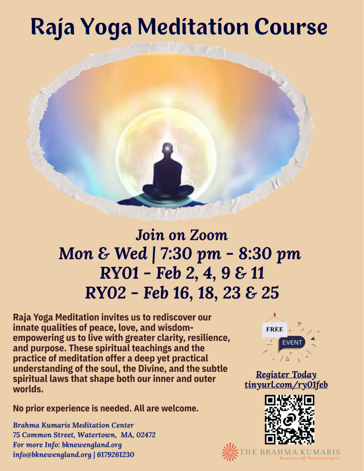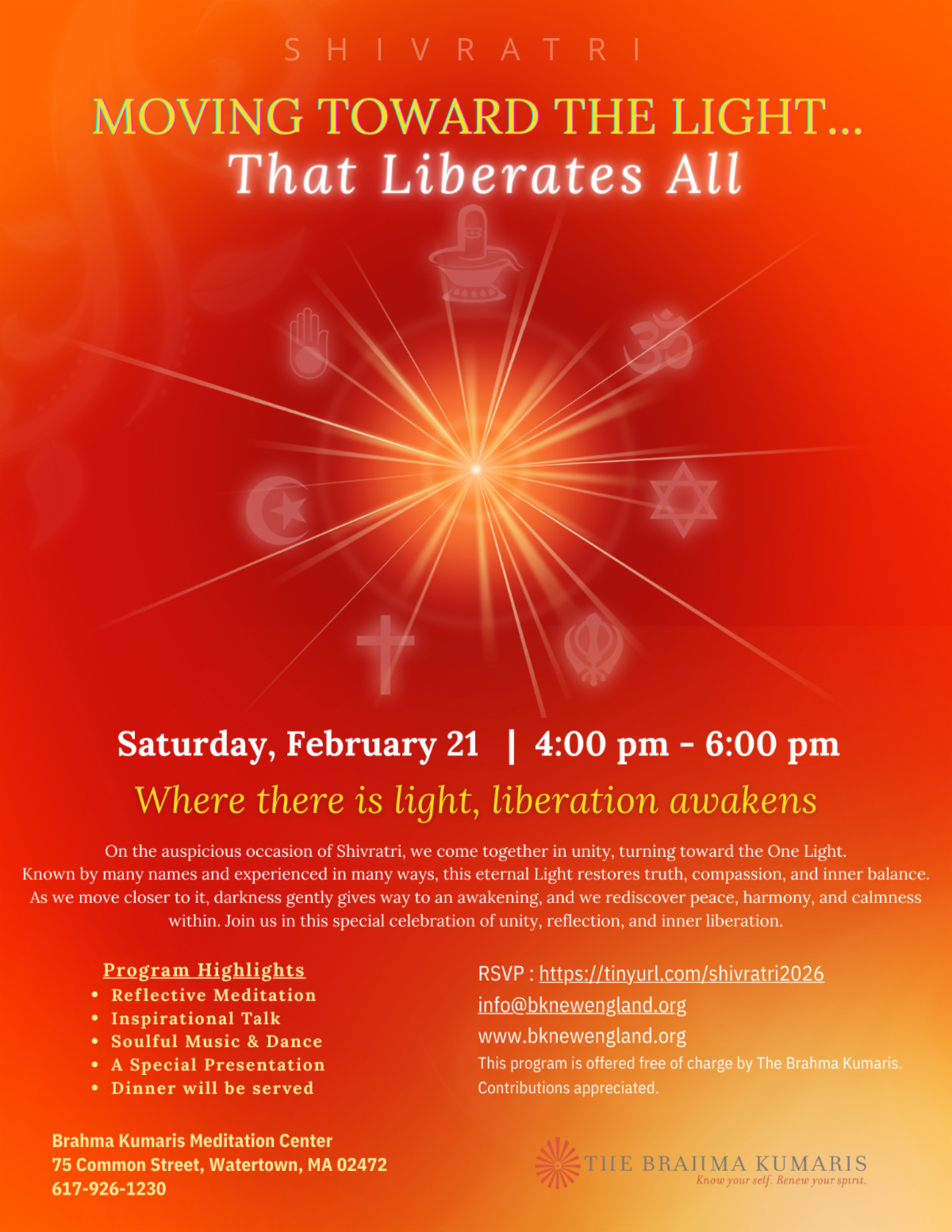 Press Release 01/29/2026 A Very Special Event of The Month! No Registration Required! No Registration Required! World Peace Meditation Hour Sunday, Feb 15th | 6:30 pm - 7:30 pm You are welcome to join us in person or on Zoom No Registration Required Brahma Kumaris Meditation Center 75 Common Street, Watertown MA 02472 617-926-1230 You may also access this article through our web-site http://www.lokvani.com/ |