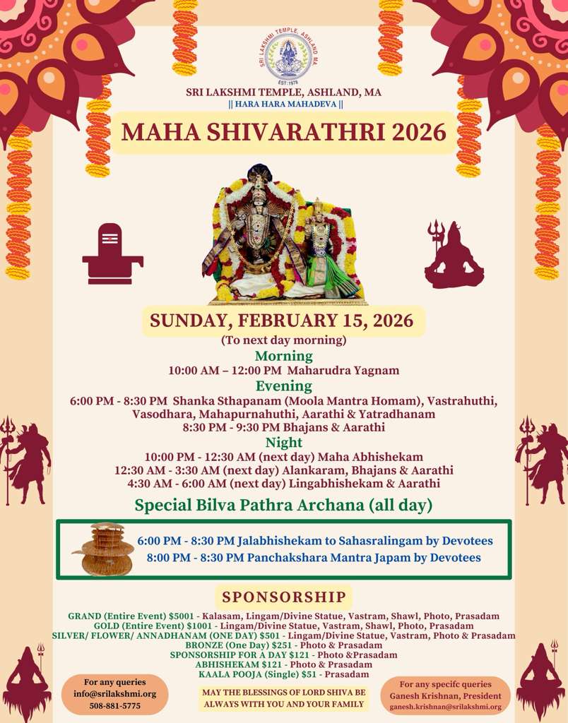 Ganesh Krishnan 02/12/2026 Maha Shivaratri Celebrations at Sri Lakshmi Temple Sri Lakshmi Temple in Ashland warmly invites devotees and community members to participate in the sacred observance of Maha Shivaratri on Sunday, February 15, 2026 — a spiritually significant night dedicated to prayer, reflection, and the worship of Lord Shiva. The temple’s annual celebration will feature a full day and night of traditional rituals, devotional music, and collective worship, offering devotees an opportunity for inner transformation and spiritual awakening. Maha Shivaratri, revered as a time for renewal and deep devotion, will be marked by a series of sacred ceremonies beginning in the morning and continuing through the early hours of the following day. The celebrations will open with the Maharudra Yagnam from 10:00 AM to 12:00 PM, invoking divine blessings through Vedic chants and offerings. The evening program, scheduled from 6:00 PM to 8:30 PM, will include Shanka Sthapanam (Moola Mantra Homam), Vastrahuthi, Vasodhara, Mahapurnahuthi, Aarathi, and Yatradhanam. During this time, devotees will also have the opportunity to perform Jalabhishekam to the Sahasralingam, followed by Panchakshara Mantra Japam and devotional Bhajans. The night-long worship will continue with a Maha Abhishekam from 10:00 PM to 12:30 AM, followed by Alankaram, Bhajans, and Aarathi until 3:30 AM. The sacred observances will conclude at dawn with Lingabhishekam and Aarathi from 4:30 AM to 6:00 AM. Throughout the day, special observances such as Bilva Pathra Archana will be available. Devotees are especially encouraged to participate in Bilva Archana and Jalabhishekam — two highly auspicious forms of worship associated with Lord Shiva, believed to bring spiritual purification, blessings, and inner peace. As part of the festivities, the temple will also host Nadhaanjali (devotional music offerings) and Nrithyanjali (devotional dance offerings), where musicians and dancers of all ages present classical performances as sacred expressions of bhakti. Interested participants may register using the following booking links: Devotees, families, artists, and well-wishers are warmly invited to be part of this spiritually uplifting celebration. For complete event details, sponsorship opportunities, and additional participation information, attendees are encouraged to refer to the accompanying flyer released by the temple. The Sri Lakshmi Temple community looks forward to welcoming everyone for a night of devotion, unity, and divine blessings during this sacred Maha Shivaratri observance. You may also access this article through our web-site http://www.lokvani.com/ |