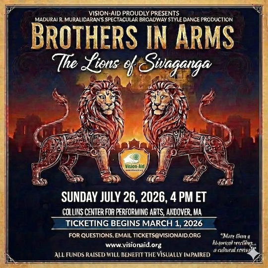 From Kathak to high-energy folk dances and Bharatanatyam, get ready for a production that ignites pride and remembrance.Vision-Aid's grand productions for the past 18 years need no introduction to New England audiences, and this year's show takes it to a whole new level bringing to Boston, a spectacular new choreography by renowned dance producer Kalaimamani Madurai R. Muralidaran, ably assisted by super talented Boston area Artistic Directors Jeyanthi Ghatraju and Sripriya Natarajan Moorthy, with several leading area dance teachers and 50+ dancers.