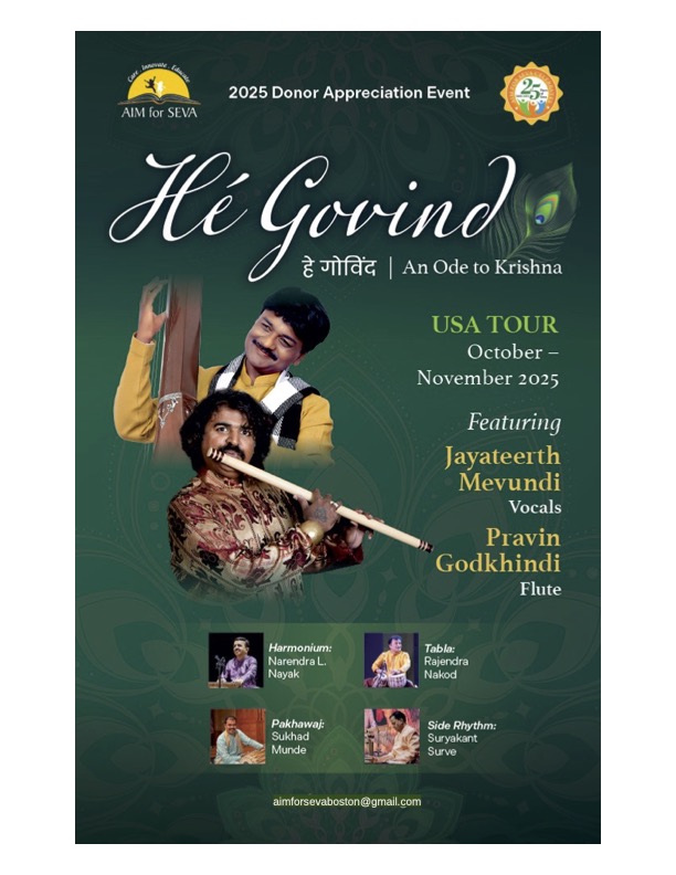 Date: 10/31/2025 Location: Regis College Fine Arts Center 235 Wellesley St., Weston Time: 6:00 pm Organized By: AIM for Seva Food: Vegetarian food will be served to all participants Contact: Boston Chapter Coordinators Kumar Balasubramanian 508-734-0419 aimforsevaboston@gmail.com Kumar Nochur 617-967-1741 Web: https://aimforsevausa.org/boston-chapter/ Email: aimforsevaboston@gmail.com | | |||||||||||||||||||||||||||||||||||||||||||||||||||||||||||||||