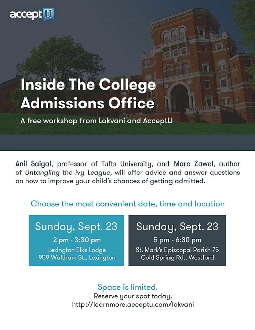 | Lokvani College Admissions Workshops | Lokvani and AcceptU will be offering two free workshops, “Inside the College Admissions Office,” on Sunday, September 23 in Lexington and Westford, MA.