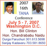 Telugu Association of North America invites you to the "Destination AP: Capitalizing on a Flat World" conference from July 5-7, 2007 at the Washington Convention Center, Washington DC, featuring former US President, Bill Clinton, Mr. Chandrababu Naidu,Sri Sri Ravi Sankar, Vikram Akula, Janaki Akella, Srini Akkaraju and others. [more] |