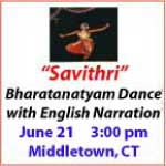 , a student of Ranjani Saigal will present Savithri in Bharatanatyam style on June 21 at Keigwin Middle School, Middletown CT to the accompaniment of live music by Geeta Murali, Dr. Bhavani Prakash, Rasika Murali and Arun Saigal. This creation by Ranjani Saigal includes english narration with traditional Bharatanatyam. [more] |