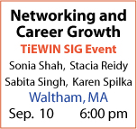 TiEWIN invites you to come and meet three prominent leaders, Senator Karen Spilka, Judge Sabita Singh, and Eustacia Reidy speak about their experiences and career growth on September 10th. [more] |