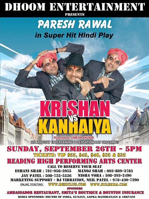 Due to overwhelming response to Paresh Rawal’s Hindi drama Krishan V/S Kanhaiya, Eshani Shah of Dhoom Entertainment announces a second show of the Drama in the afternoon at 1:30 pm on September 26th, 2010. The shows are planned at 1:30 pm and 5 pm at Reading Memorial High School Auditorium in Reading MA. [more] |