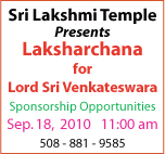 Sep. 18, a very special puja, Laksharchana for Lord Venketashwara will be held at the Shri Lakshmi temple in Ashlans. It is a very auspicious event. Learn how you can participate. [more] |