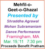 Catch up, register and purchase tickets for the events and concerts during this upcoming fortnight including Shaam-E-Ghazal, Chirag Katti, Ja Tarri Sathe Katta, Mehfil-o-Geet-o-Ghazal, IITSINE Annual Social, B Balasubrahmaniyan, 6th Annual Learnquest Classical Music Conference, Moods of the Goddess, Eclectic Euphoria, Chinmaya Mission-Triple Carnatic Concerts and TiECON East 2011. [more] |