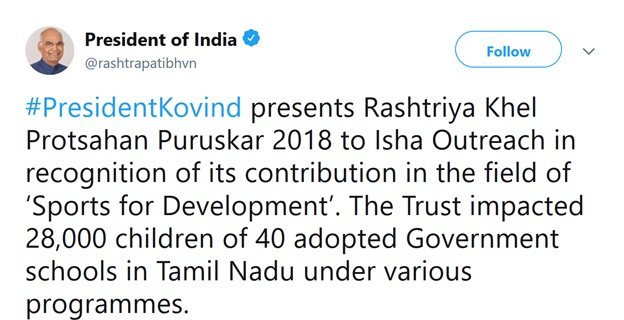 Press Release 09/27/2018 Sadhguru receives Rashtriya Khel Protsahan Puruskar 2018 Sadhguru receiving Rashtriya Khel Protsahan Award from the Hon'ble President Isha Gramotsavam – Celebrating the Sporting Spirit of Rural India Isha Gramotsavam is a celebration of village life showcasing the essence of rural Tamil Nadu through an elaborate display of rural games, art, drama, dance, music and food specialties. The event highlights the role of sports in rural life by featuring the final rounds of a state-wide inter-village sports tournament. The festival is part of Action for Rural Rejuvenation (ARR), a rural revitalization program under the aegis of Isha Foundation. ARR provides a comprehensive approach to improved health, livelihood and community revitalization, and to date has reached over 4600 villages and forty-two lakh people. (Part-1 / Part-2 / Part-3) 880 Teams | 10,360 Players | 1 Finale! | Isha Gramostam Sadhguru had a very lively & hot debate with budding lawyers from a premier institute in Hyderabad (NALSAR) September 23rd 2018 Youth and Truth | Sadhguru, Isha Foundation | Nalsar University Of Law National Academy of Legal Studies and Research, is a legal studies institution located in Shamirpet, Hyderabad, Telangana, India You may also access this article through our web-site http://www.lokvani.com/ |