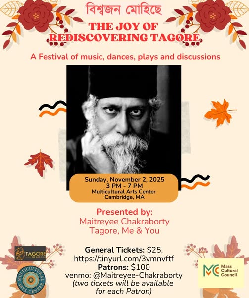| The Joy of Rediscovering Tagore A unique Tagore festival on Sunday, Nov 2nd at the Cambridge Multicultural Arts Center. Not only will you hear choral style melody, see dance and enjoy poems, you will stage short plays and hold interactive panel discussion.